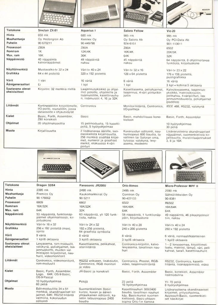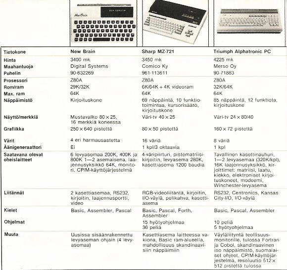”The very first issue also featured a comparison table of all the computers available for sale in Finland at the time. When I started my collecting hobby, I decided to collect every single computer listed in that magazine. I have almost succeeded. I am still missing a computer called the NewBrain. Would you happen to have one to donate or sell to me?”